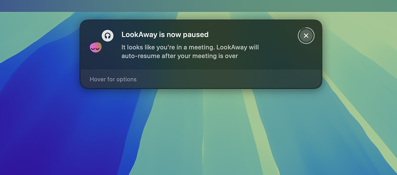 Also, just because your calendar says a meeting ended at 2:00 PM doesn't mean you're done. Maybe you're writing follow-up notes, or still wrapping up mentally. LookAway detects long periods of calls or meetings and gives you a short grace period before prompting a break. This respects the post-meeting transition time and avoids punishing you the moment you become 'available'.