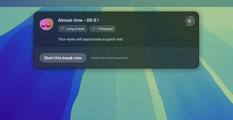 No one likes to feel forced. If a break reminder shows up when you’re not ready, it feels like a power play. But when you can delay it, snooze it, or skip it entirely, the dynamic shifts. It’s your choice. You’re still being nudged, but gently - and that makes all the difference. Giving people simple controls helps them build a habit on their own terms.