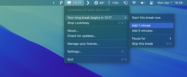 So to keep things simple, I added two options for delaying a break - postpone the break by 1 minute or 5 minutes. If you need more time than that, it might actually be a good moment to take the break - or you can choose to skip it entirely.